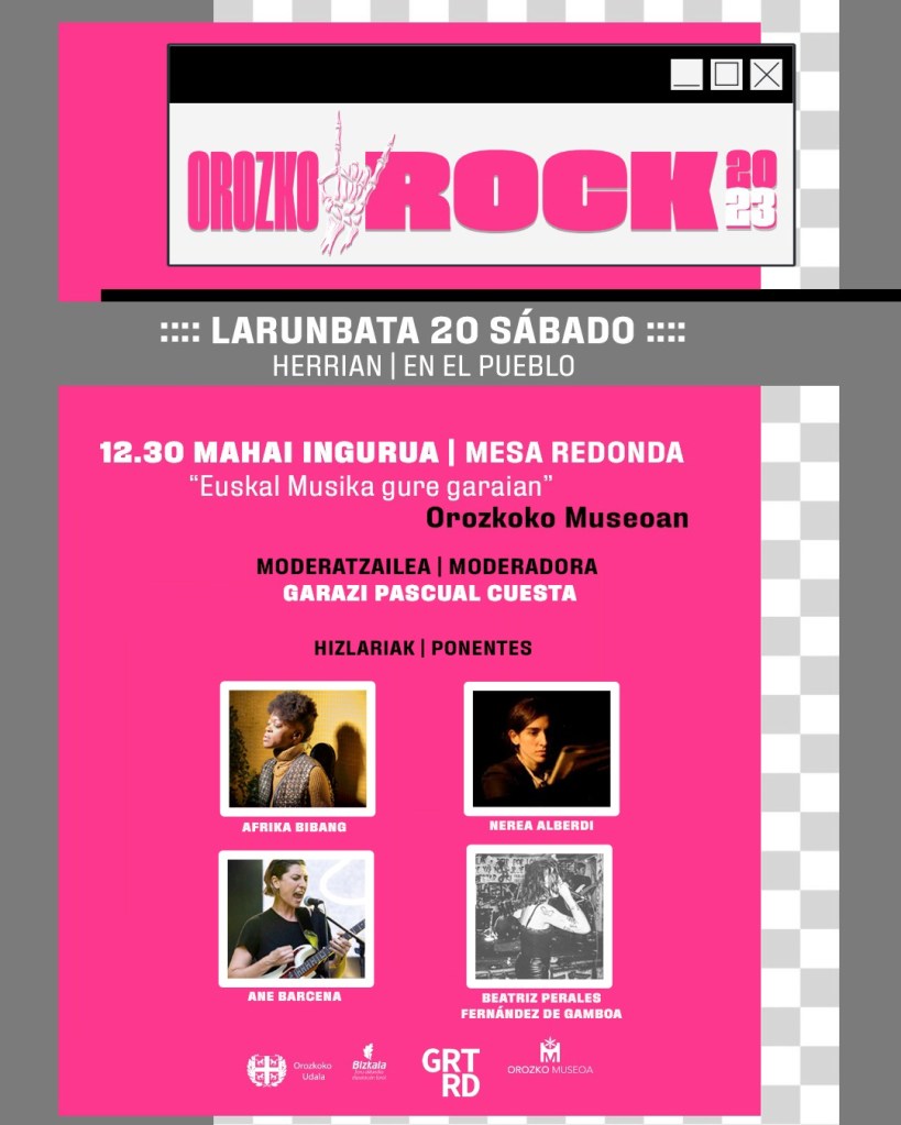 Este año el festival se expande e incluye otras actividades además de los conciertos, y Gertrude Kultur Elkartea hemos tenido el placer de colaborar organizando una mesa redonda a la que hemos invitado a hablar sobre la situación de la música vasca en la actualidad a cuatro expertas de lujo en la materia: Afrika Bibang, Nerea Alberdi, Ane Bárcena y Beatriz Perales, quienes nos hablarán de sus trayectorias y experiencias guiadas por la doctora en filosofía Garazi Pascual, la cual se encargará de dinamizar una charla, que promete ser de lo más interesante.